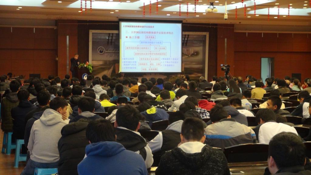 刘国生校长为蔡健教授颁发了客座教授聘书。蔡健教授是华南理工大学建筑学院土木工程系的教授、博士导师,同时担任中国土木工程学会理事、《建筑结构学报》编委等学术兼职;不仅是注册一级结构工程师、注册监理工程师、香港注册测量师,还主持多项科研项目,拥有较高的学术地位。蔡健教授从常见安装技术、安装技术特点及相关案例三个方面展开。历时近80分钟,蔡健教授不仅声情并茂地向大家展示了“高空直接拼装法”、“分单元拼装法”、“高空滑移法”和“整体提升法”四种安装技术的基本原理、安装技术特点、关键要点及施工步骤;同时还结合白云机场、佛山地铁旁金融商圈建筑等的整体提升案例进行了详细的解说,并与师生进行了互动,与会师生兴趣高涨,认真听讲,受益匪浅。