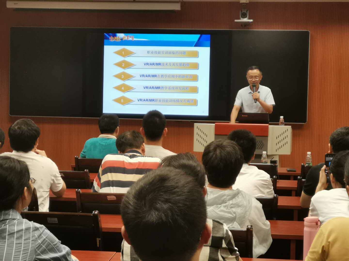 讲座中,王教授从职业技能实训面临的问题为出发点,讲述了VR/AR/MR技术及其发展的趋势,探讨了当前技术在教育活动中的应用,并且提出相关教育系统的开发流程,最后展示了有关VR/AR/MR的教学成果,在座教师大开眼界,深受启发。在交流互动环节,王教授与教师就开设数字媒体专业的师资建设、实训室建设、人才培养、学生就业等方面进行了深入的探讨,给出了很多实质性的建议,教师们受益匪浅。